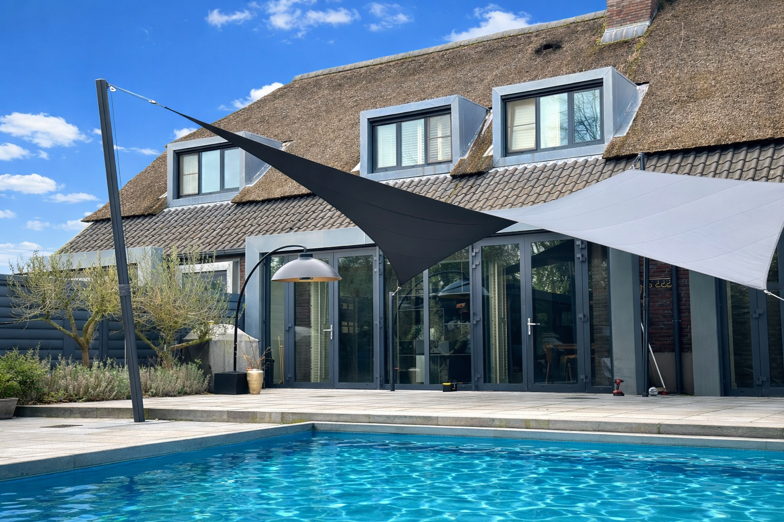 Geen standaard schaduwdoek, maar een ontwerp dat reageert op het huis, het licht en het dagelijkse gebruik. Een maatwerk schaduwdoek in Slate Heather vormt nu een helder vlak boven het terras. De masten zijn uitgevoerd in dezelfde RAL-kleur als de kozijnen. Daardoor voelt het geheel vanzelfsprekend. Alsof het altijd zo bedoeld is.